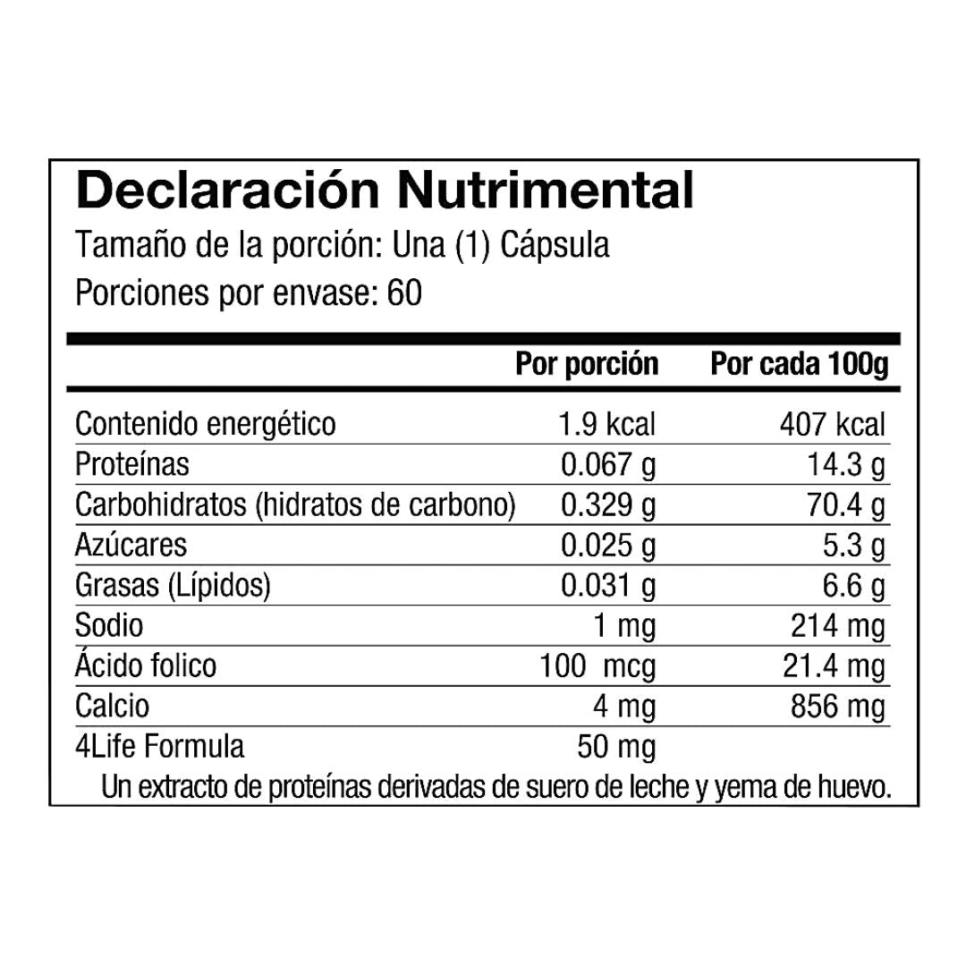 - Contiene 100 mg de 4Life Tri-Factor® Formula por cada porción de 2 cápsulas.